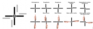 Phoriebestimmung für assoziierende Prismen. Erklärung und Durchführung Der Test ist auf einem weißen Feld, vor einem 3D-Hintergrundbild, dargestellt. Das rechte Auge sieht dabei einen zentralen Doppelkreis, eine Linie, die oberhalb senkrecht, und eine Linie, die waagerecht rechts vom Doppelkreis ist. Das linke Auge sieht ebenfalls den Doppelkreis zentral, eine Linie die senkrecht unterhalb, und eine Linie, die waagerecht links vom Doppelkreis ist. In Invers-Darstellung drehen sich die Seheindrücke um. Zur besseren Kommunikation mit dem Prüfling wird er gebeten seine Hände zur Hilfe zu nehmen. Die rechte Hand für den oberen senkrechten bzw. den rechten waagerechten Strich und die linke Hand für den unteren senkrechten bzw. den linken waagerechten Strich, um die Auslenkung der Striche anzuzeigen. Was tun bei Auffälligkeiten