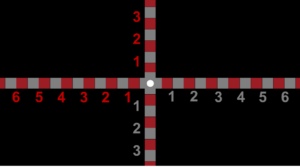Es werden zwei Zeilen übereinander für Sehschwache angeboten mit einer zentralen Fusionsverriegelung zum Testen auf Refraktionsgleichgewicht mit einem Visus von 0,1 bis 0,05.